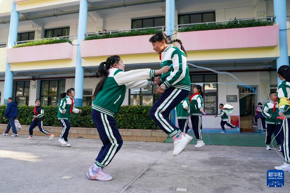 2月28日,昆明市金康園小學學生在教學樓前跳繩。新華社記者 陳欣波 攝