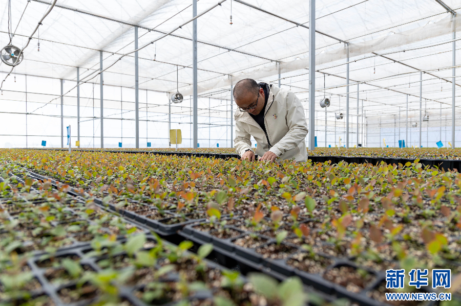 林龍正在查看藍莓苗(2月27日攝)。新華網發(李浩 攝)