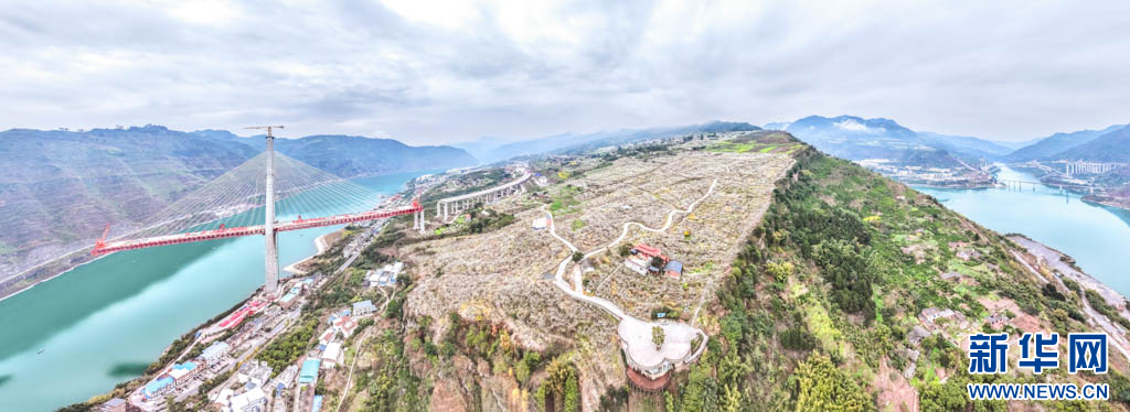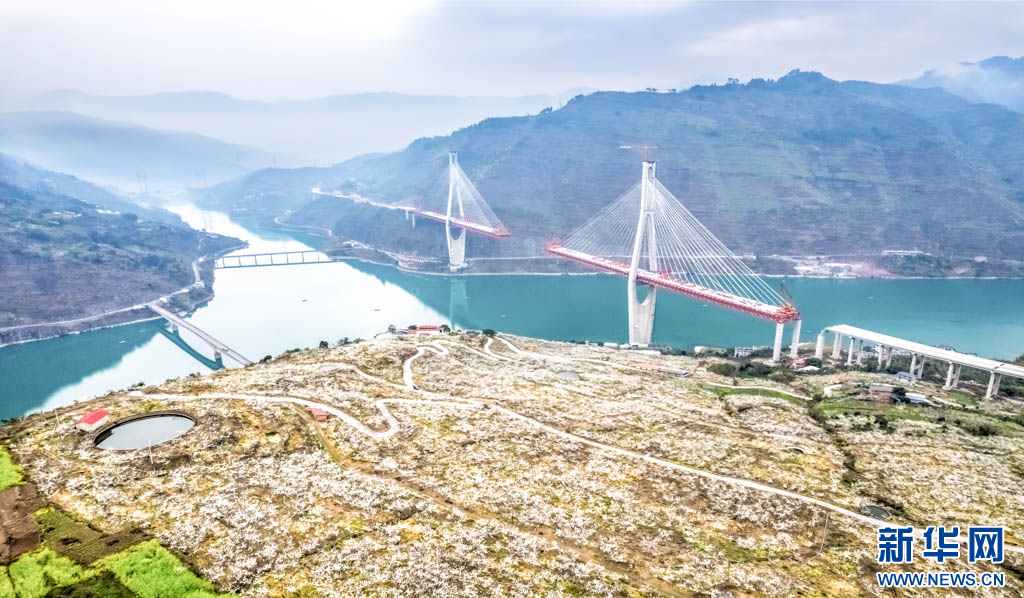 李花與遠處的金沙江及在建的橋梁交織如畫(3月12日攝)。新華網發(曾三東 攝)