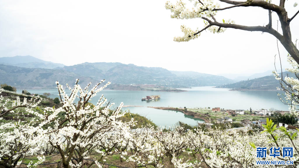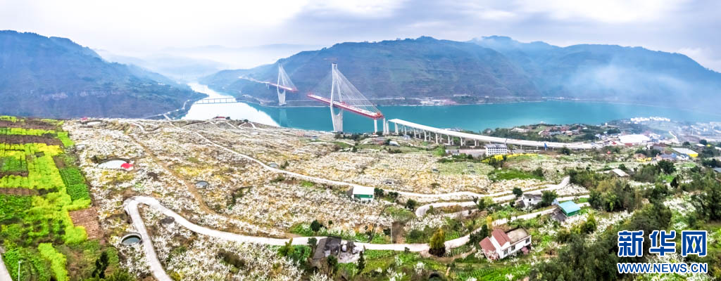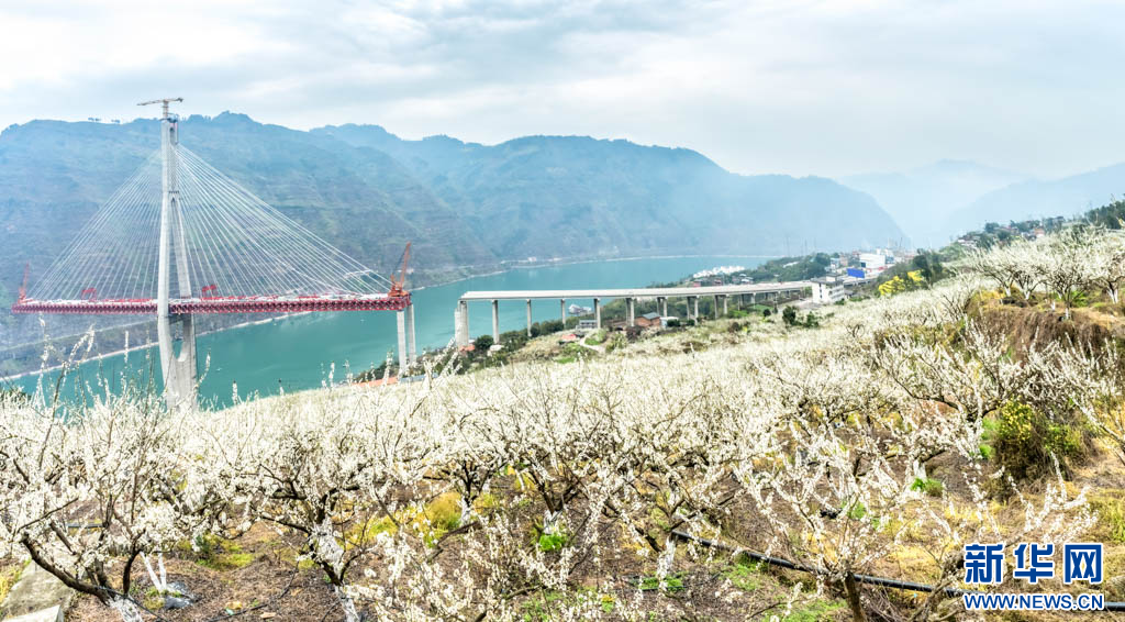 漫坡李花與遠處的金沙江及在建的橋梁交織如畫(3月12日攝)。新華網發(曾三東 攝)
