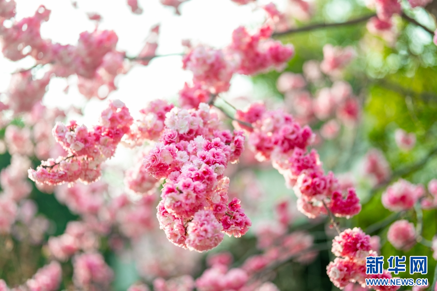 昆明市尋甸縣縣城道路兩旁,櫻花競相綻放,形成一條“櫻花長廊”(3月13日攝)。新華網發(徐俊 攝)