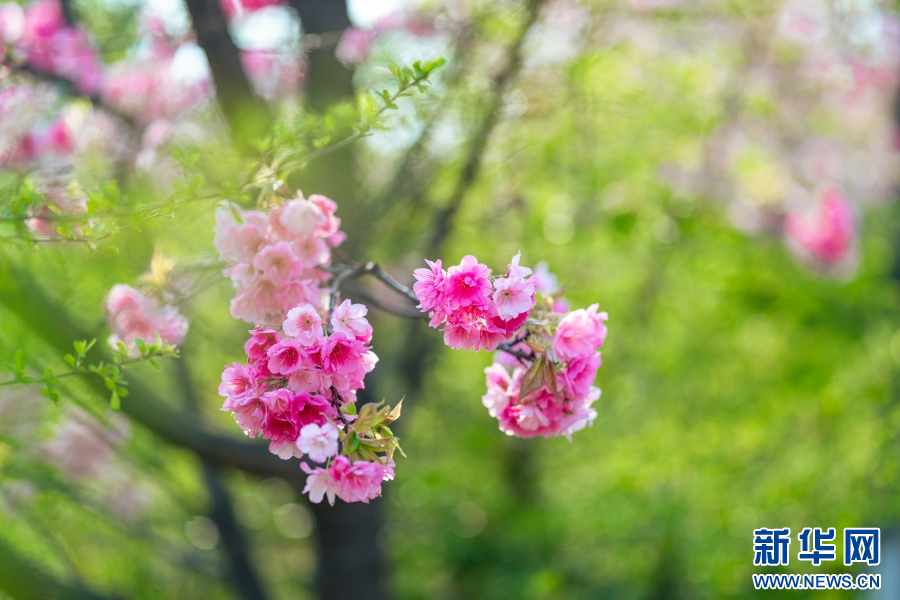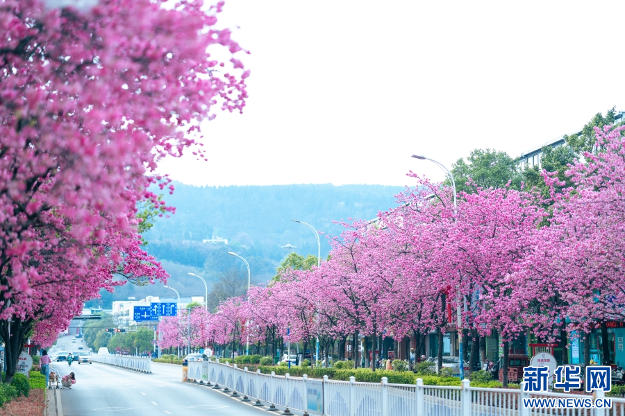 昆明市尋甸縣縣城道路兩旁綻放的櫻花(3月13日攝)。新華網發(徐俊 攝)