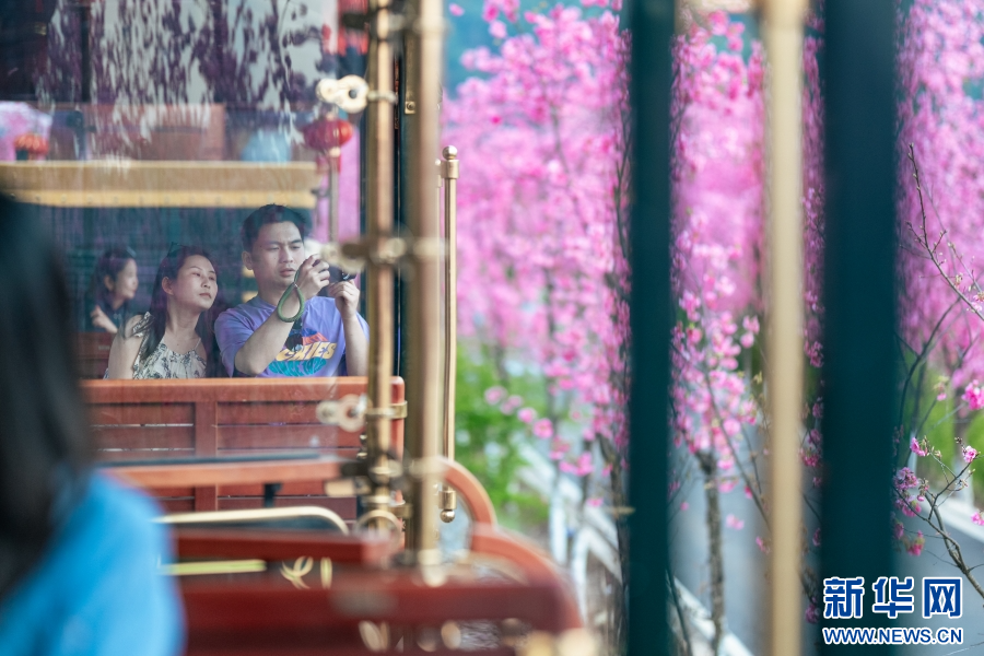 昆明市尋甸縣鳳龍灣童話鎮,游客乘小火車賞花拍照(3月13日攝)。新華網發(徐俊 攝)