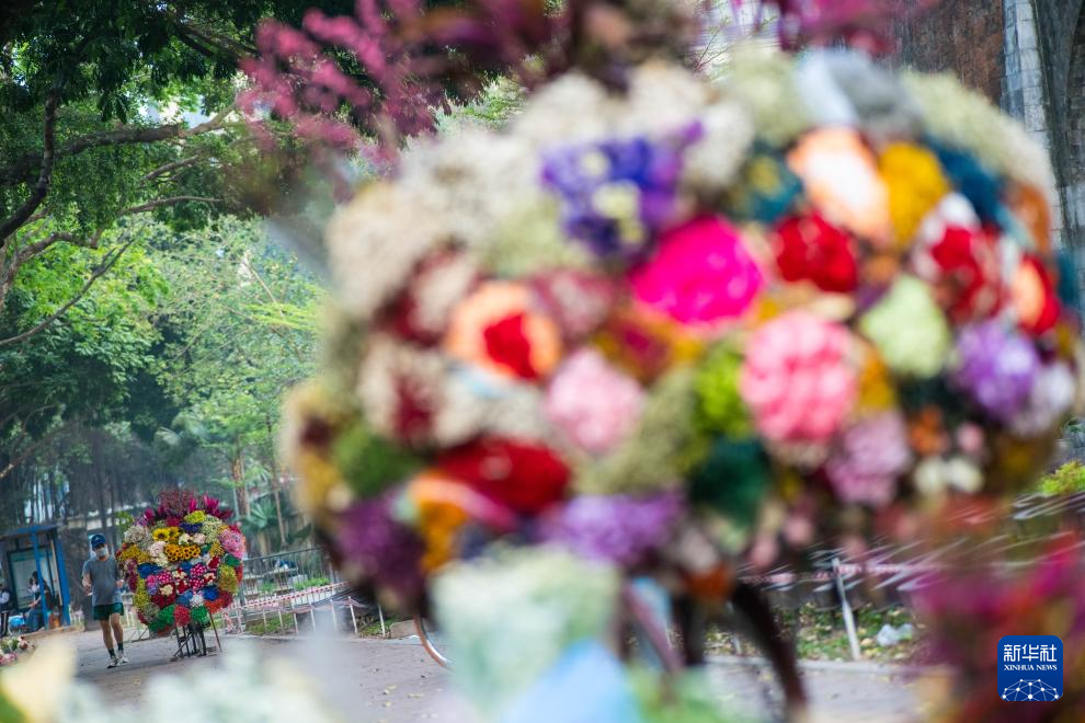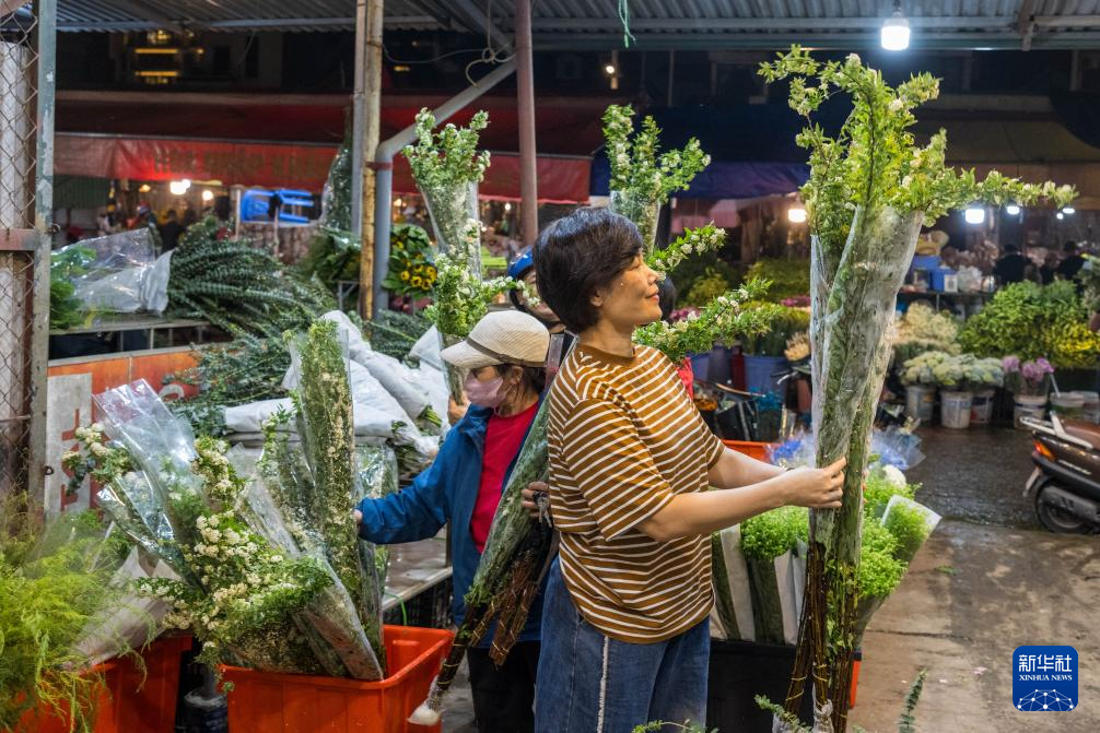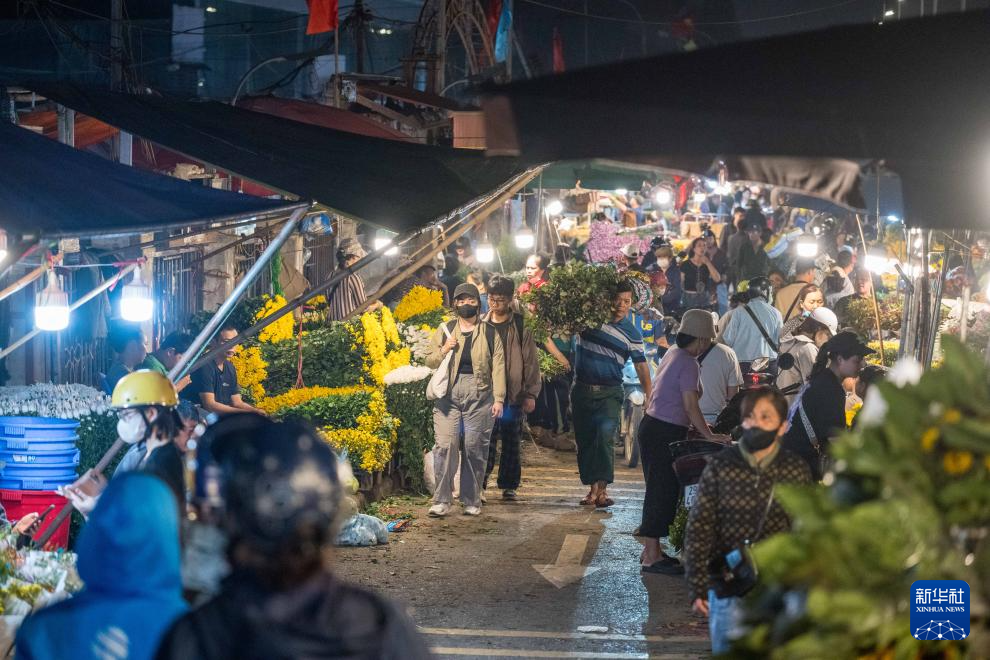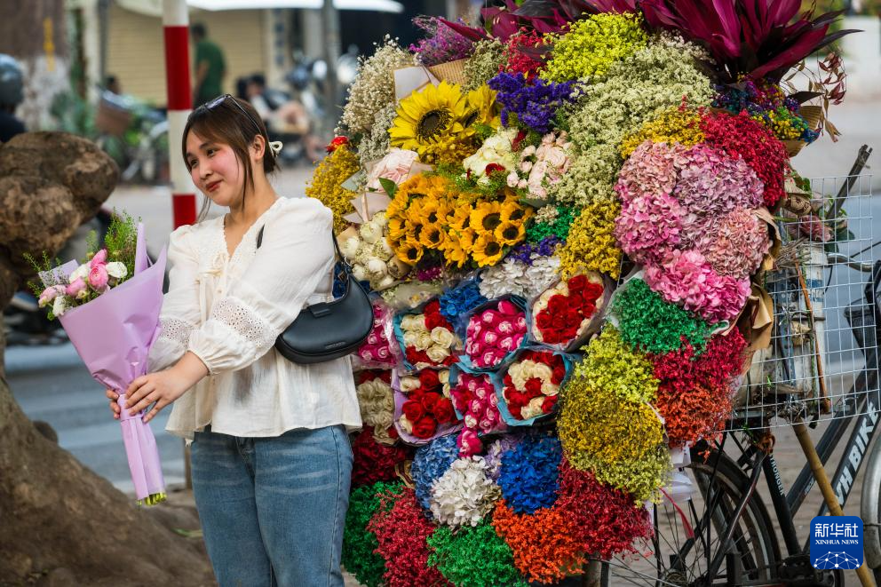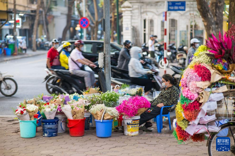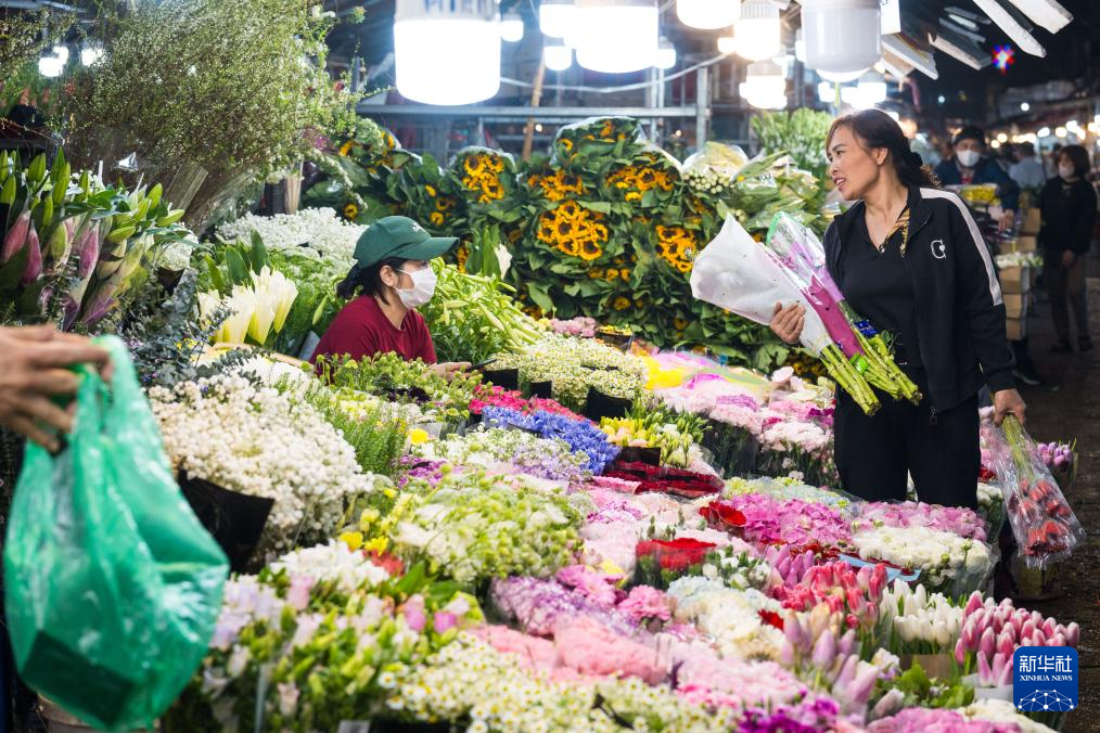 3月28日,在越南河內廣霸花市,商販將產自中國云南的鮮花擺上攤位。