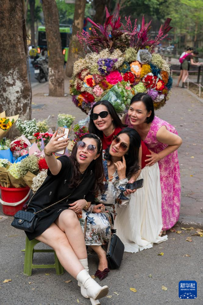3月25日,人們在越南河內街頭與“自行花車”合影。