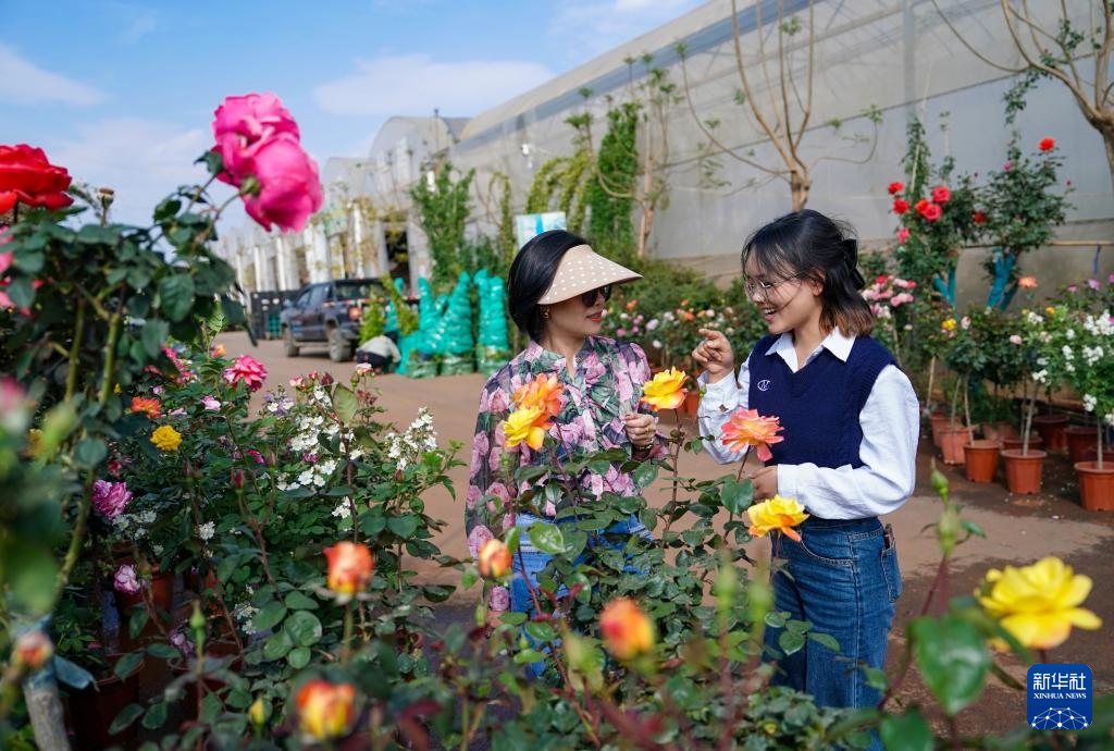 4月11日,越南花商阮翠云(左)與翻譯李青歌在中國云南昆明斗南一花卉基地內查看鮮花品質。