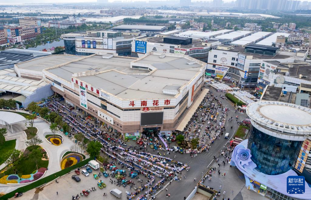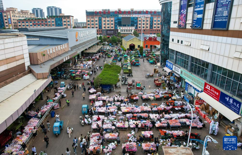 4月11日,花商在中國云南昆明斗南花卉市場內售賣鮮花(無人機照片)。