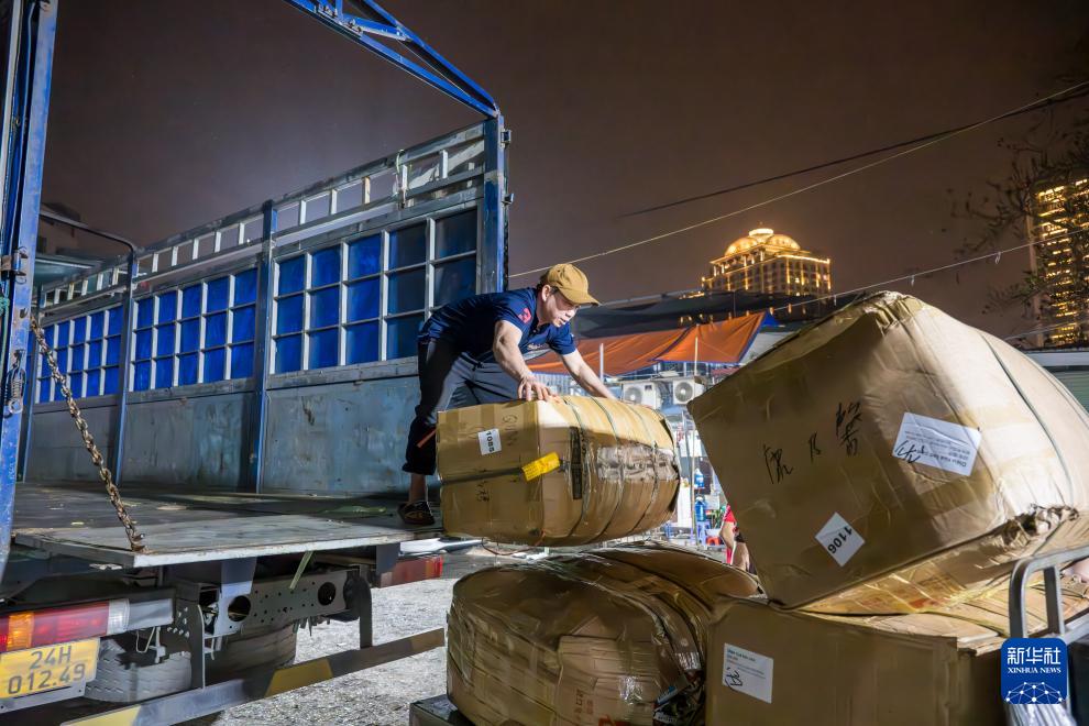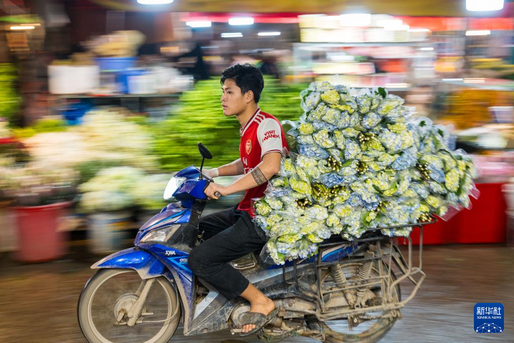 3月28日,在越南河內廣霸花市,商販將產自中國云南的鮮花從貨車上搬運下來。