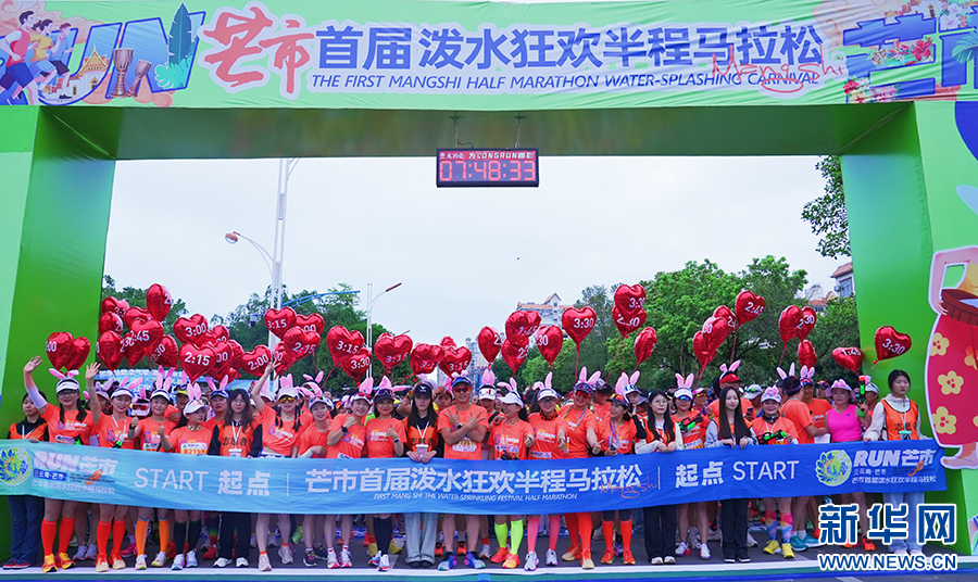 芒市首屆潑水狂歡半程馬拉松現場(4月13日攝)。新華網發(芒市融媒體中心 供圖)