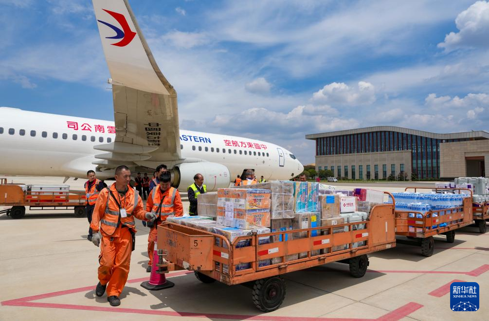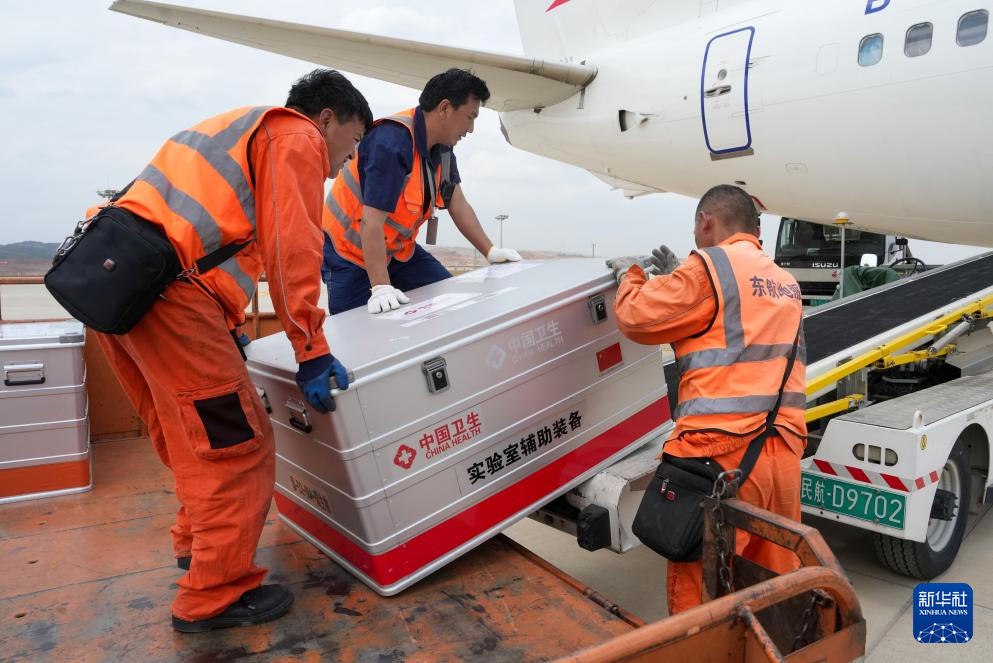 4月19日,工作人員在昆明長水機場準備將中國政府援緬衛生防疫隊攜帶的物資裝機。新華社記者 陳欣波 攝