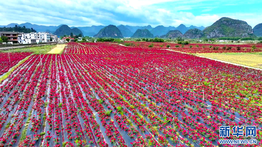 航拍千畝玫瑰花田(4月20日攝)。新華網發(丘北縣融媒體中心 供圖)