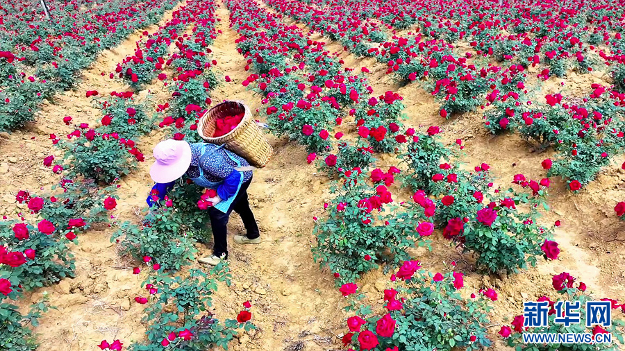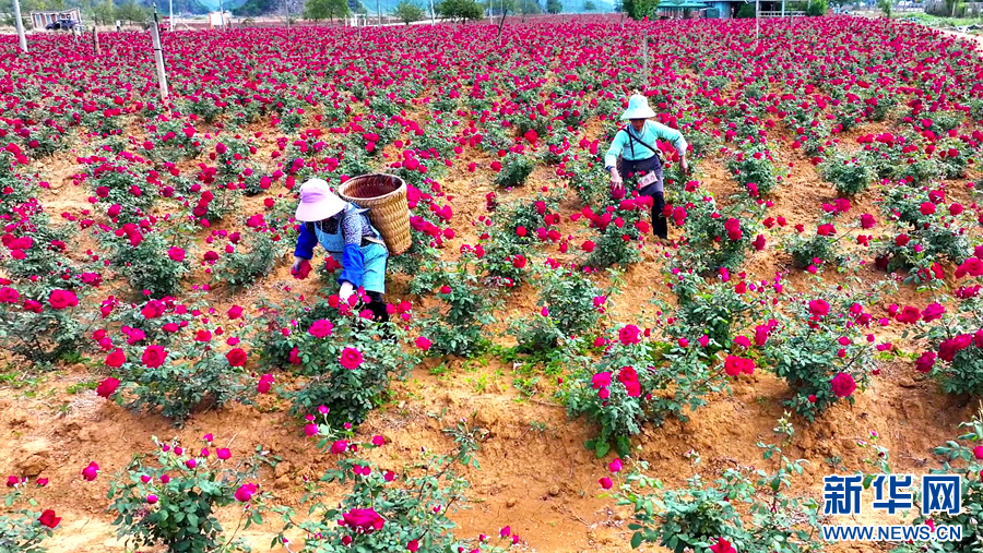 花農采摘玫瑰花(4月20日攝)。新華網發(丘北縣融媒體中心 供圖)