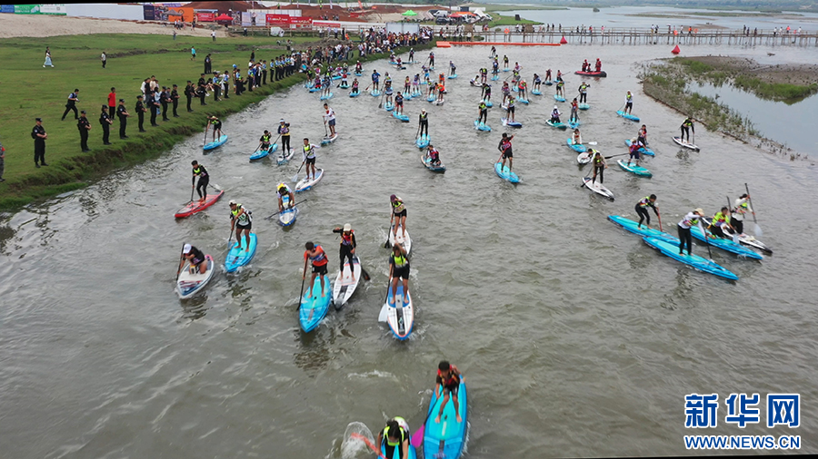 槳板賽現場(5月1日攝)。新華網發(盈江縣融媒體中心 供圖)