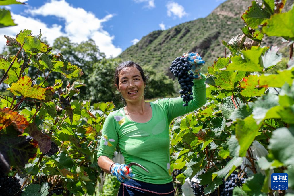2021年9月14日,云南省迪慶藏族自治州德欽縣云嶺鄉紅坡村農民展示自家種植的葡萄。新華社記者 胡超 攝
