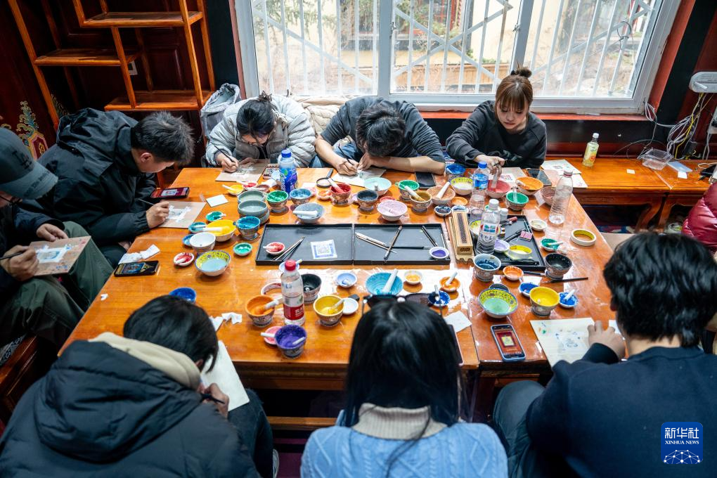 2025年3月6日,在獨克宗古城金龍社區非遺體驗中心,游客體驗繪制唐卡。新華社記者 胡超 攝