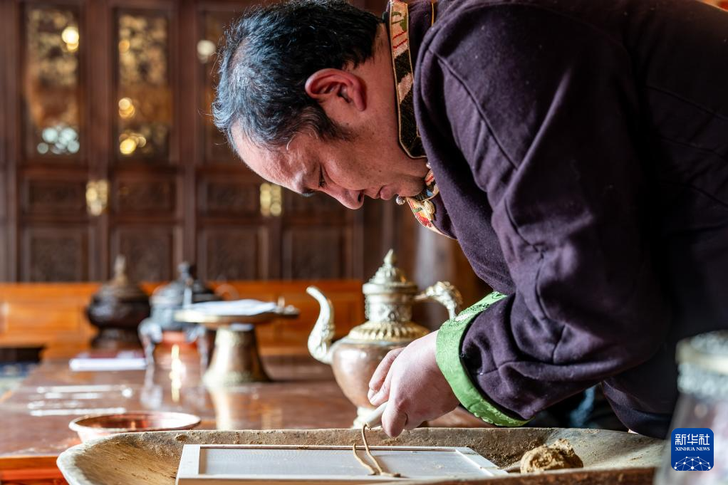 2025年3月6日,在香格里拉市松林藏香非遺傳承館,藏族漢子向巴江參在制作藏香。新華社記者 胡超 攝