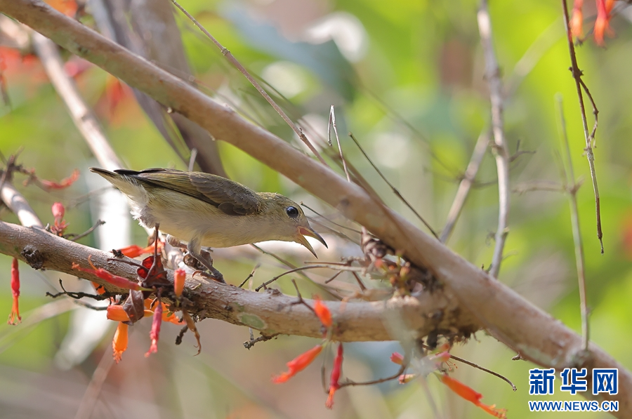 純色啄花鳥在樹枝上覓食(5月12日攝)。新華網發(楊學飛 攝)