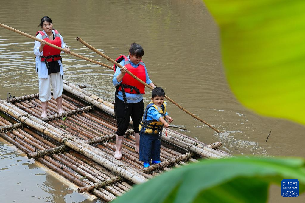 5月17日,在景洪市基諾山基諾族鄉,游客在雨林徒步項目體驗竹筏劃船。
