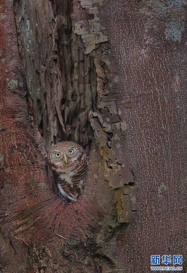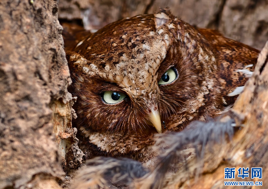 樹洞中的黃嘴角鸮(5月18日攝)。新華網發(楊學飛 攝)