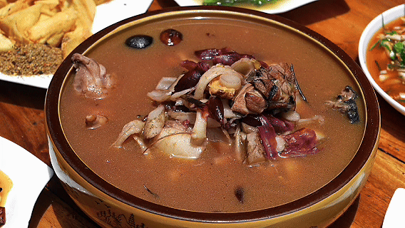 人們精選雞刺根、小紅蒜、茴香根等數十味藥根食材,配以土雞、排骨文火慢燉成湯。