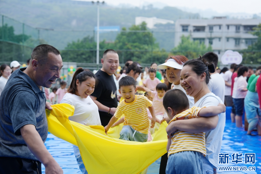 云南省水富市一幼兒園,家長、老師陪孩子們玩游戲迎“六一”(5月29日攝)。新華網發(狄廷秀 攝)