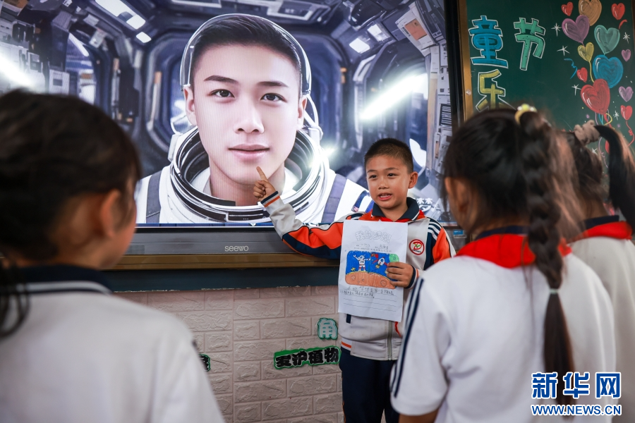 在云南省開遠市東城小學“六一玩轉科技 童心趣闖未來”主題活動中,二年級學生通過AI圖片技術,展示自己當上宇航員的樣子(5月30日攝)。新華網發(陶家淇 攝)