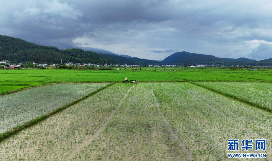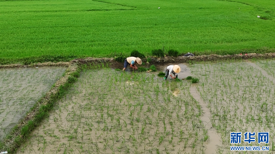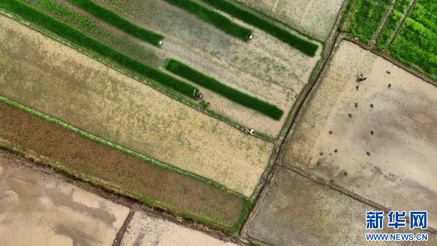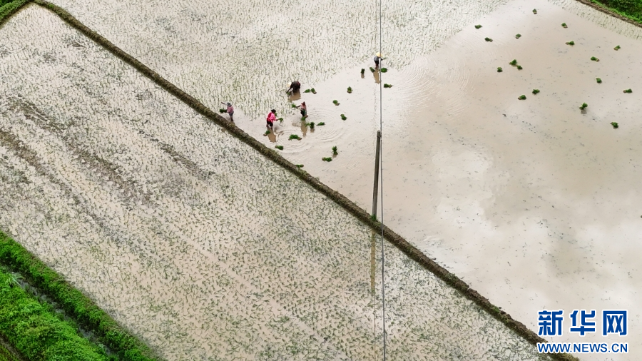 6月4日,在云南省騰沖市西源街道馬常村,農民正在栽種水稻苗(無人機照片)。新華網發(趙輝 攝)