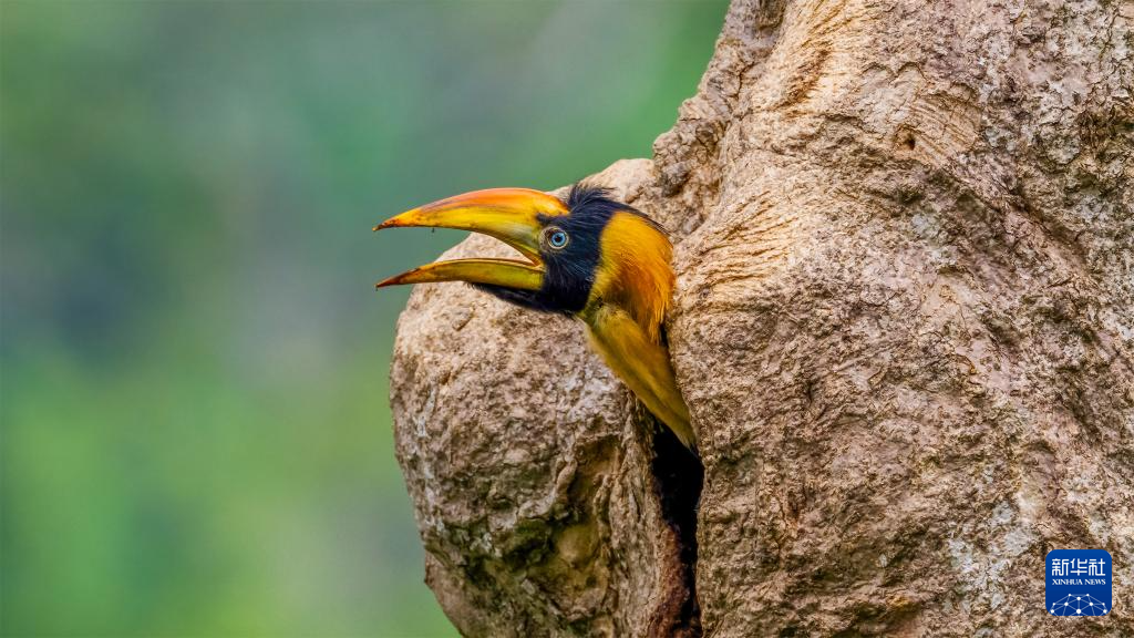 日前,在云南省德宏傣族景頗族自治州盈江縣內的“中國犀鳥谷”,一只雙角犀鳥幼鳥從樹巢里探出小腦袋。