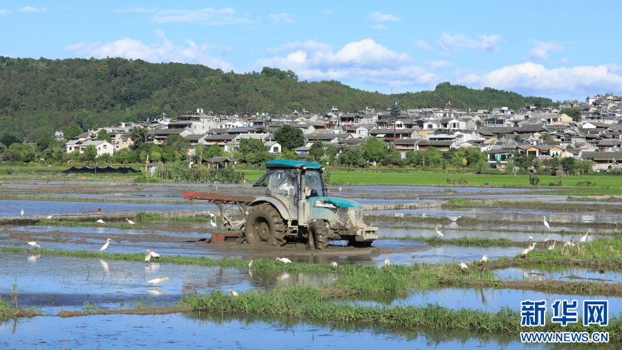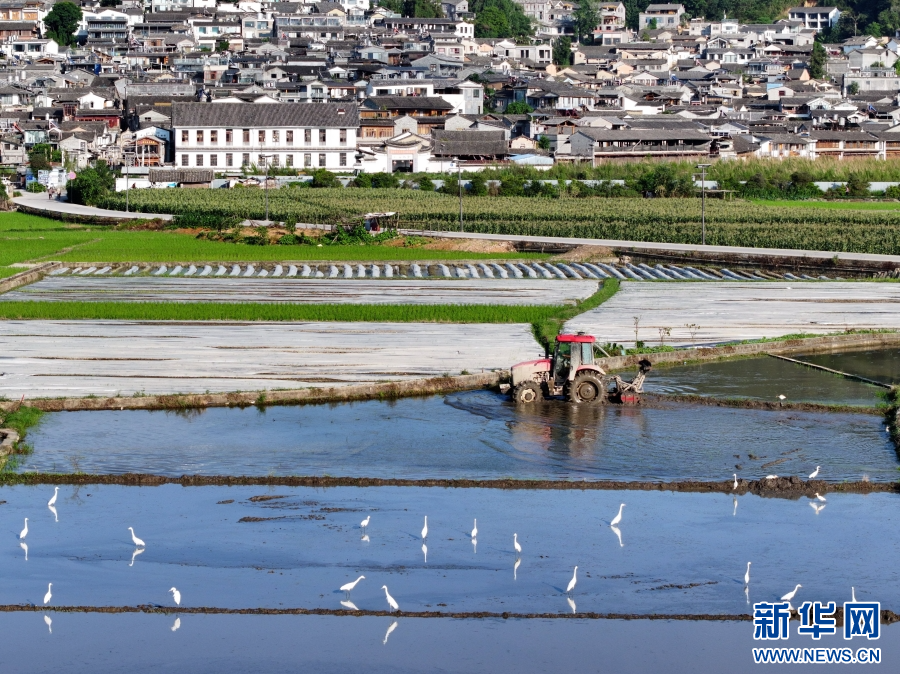 云南省騰沖市和順鎮,農機忙碌,白鷺翩躚(6月15日攝)。新華網發(龔祖金 攝)