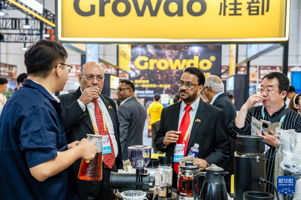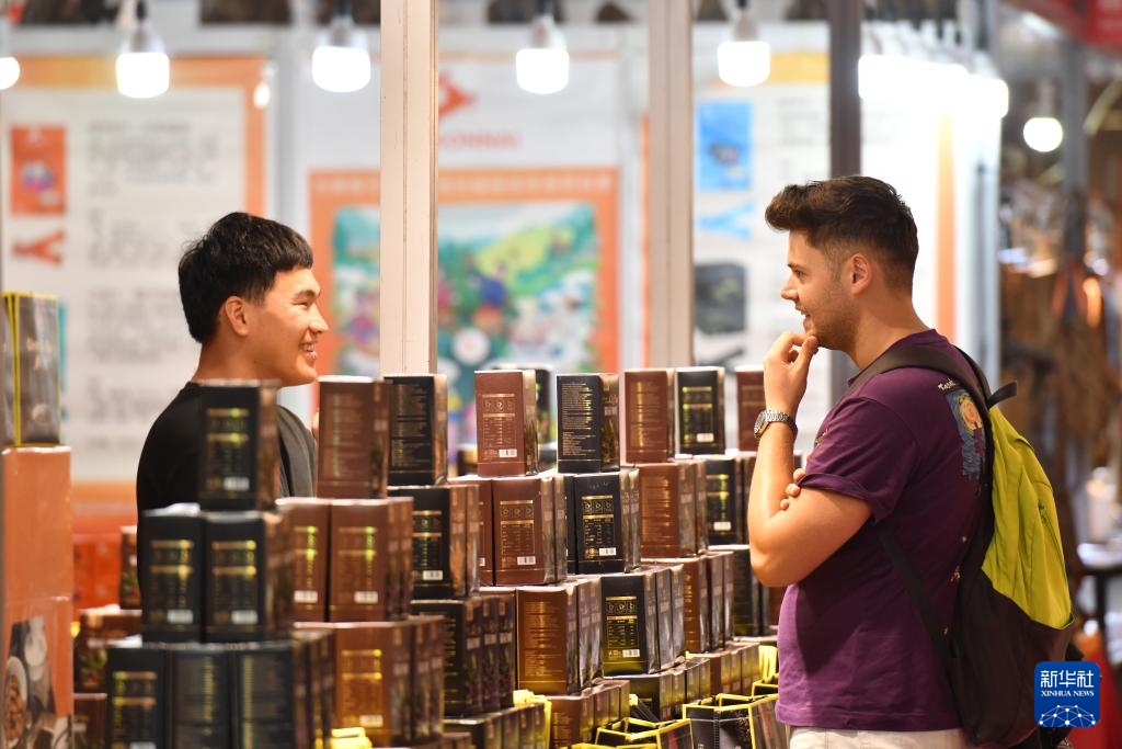 6月19日,一名越南展區的咖啡展商(左)與顧客交流。新華社發(彭奕凱攝)