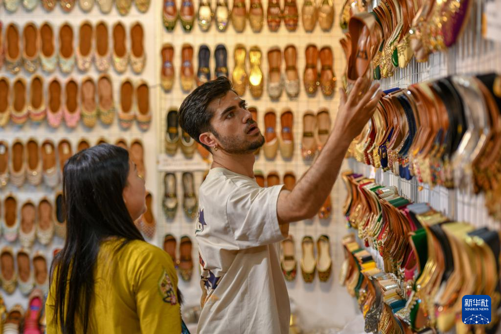 6月19日,在第9屆中國—南亞博覽會,巴基斯坦展區的參展商(右)向一名顧客推介特色鞋。新華社發(彭奕凱攝)