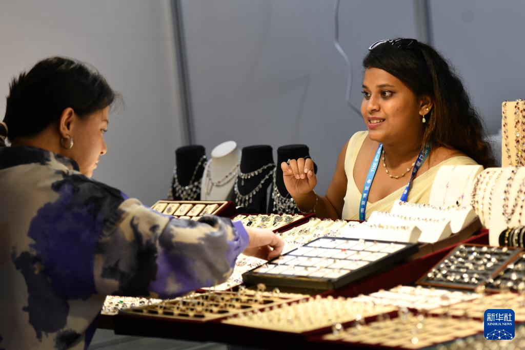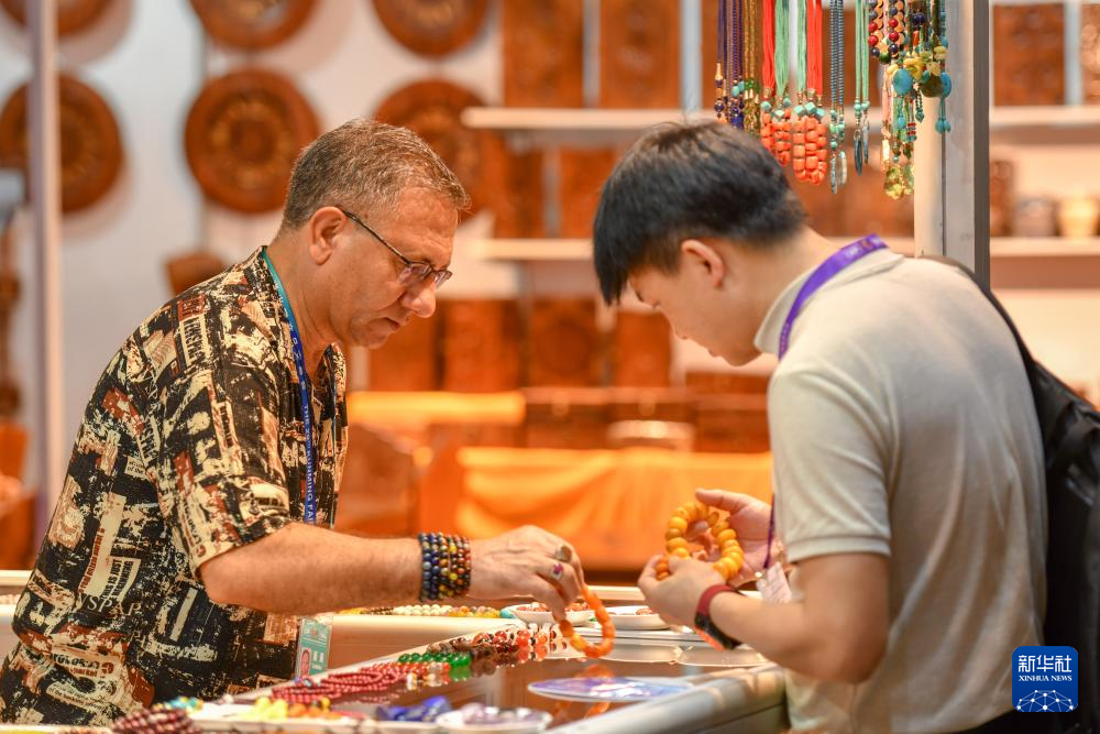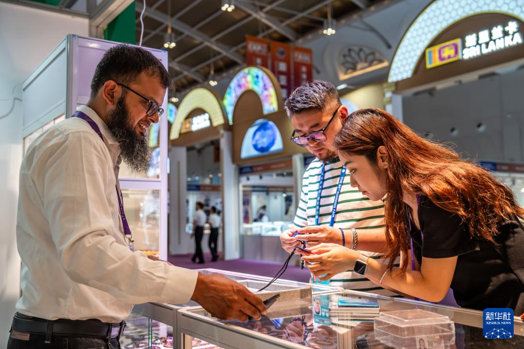 6月19日,在第9屆中國—南亞博覽會,斯里蘭卡展區的展商(右)向顧客推介特色飾品。新華社發(彭奕凱攝)