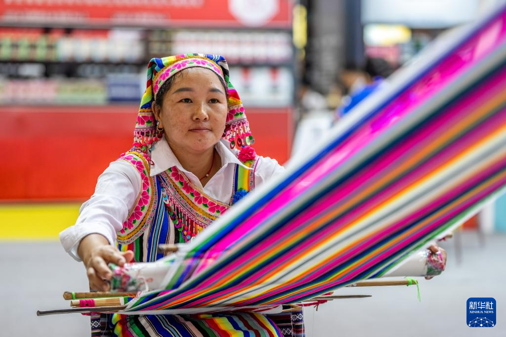 6月19日,一名獨龍族婦女在第9屆中國—南亞博覽會上織獨龍毯。新華社記者 胡超 攝