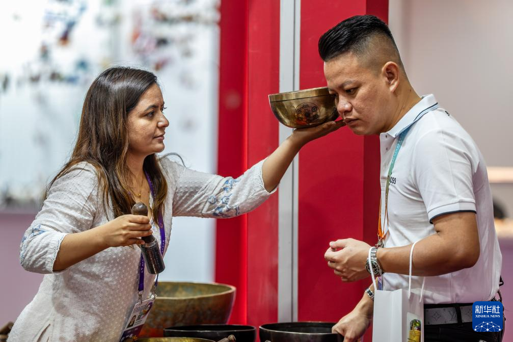 6月19日,觀眾在第9屆中國—南亞博覽會尼泊爾展區感受敲擊頌缽的聲音。新華社記者 胡超 攝