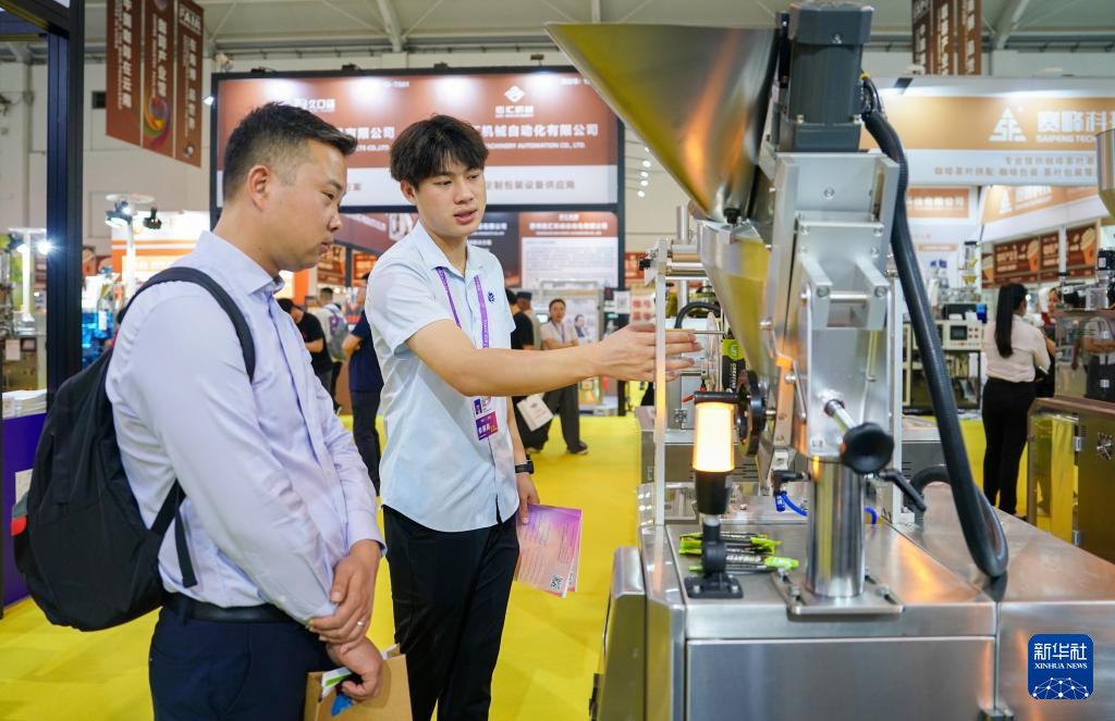 6月20日,參展商(右)在咖啡產業館向顧客介紹咖啡包裝機。新華社記者 陳欣波 攝