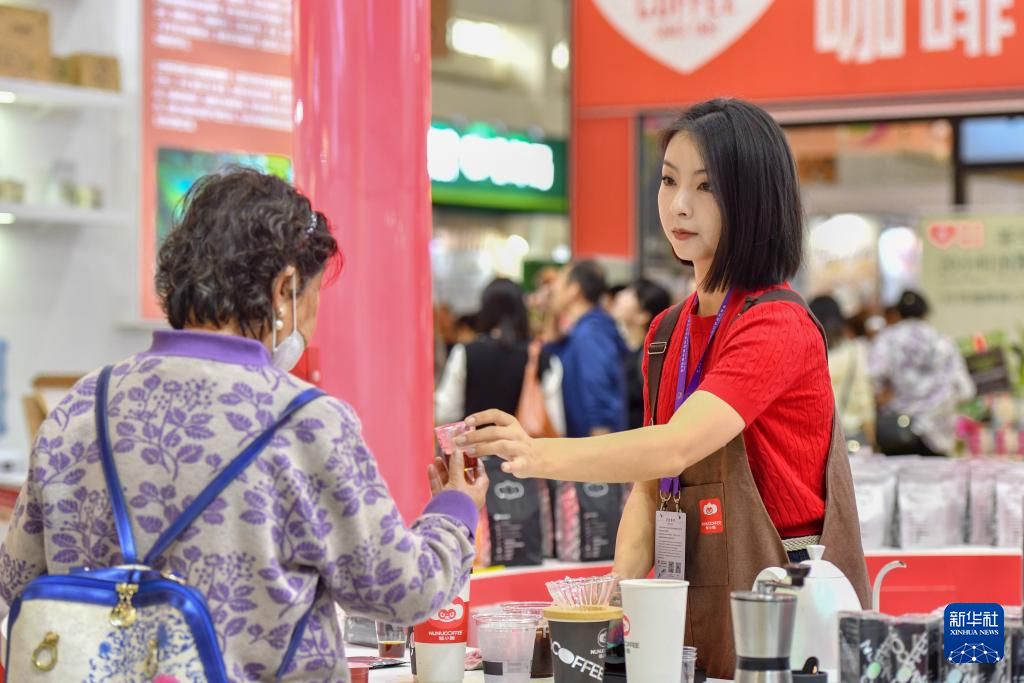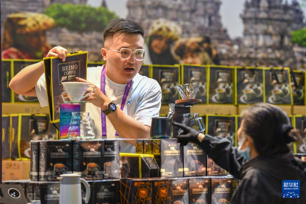 6月20日,一名參展商在咖啡產業館邀請顧客品嘗咖啡。新華社發(彭奕凱 攝)