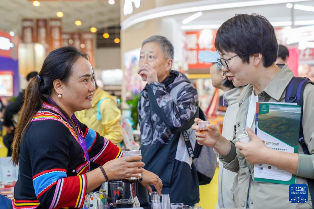 6月20日,身著民族服飾的參展商(左)在咖啡產業館邀請顧客品嘗咖啡。新華社發(彭奕凱 攝)