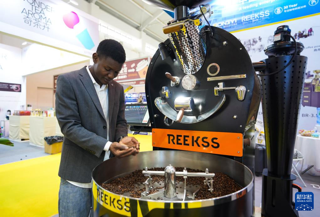 6月20日,來自尼日利亞的參展商在咖啡產業館查看咖啡豆烘焙情況。新華社記者 陳欣波 攝