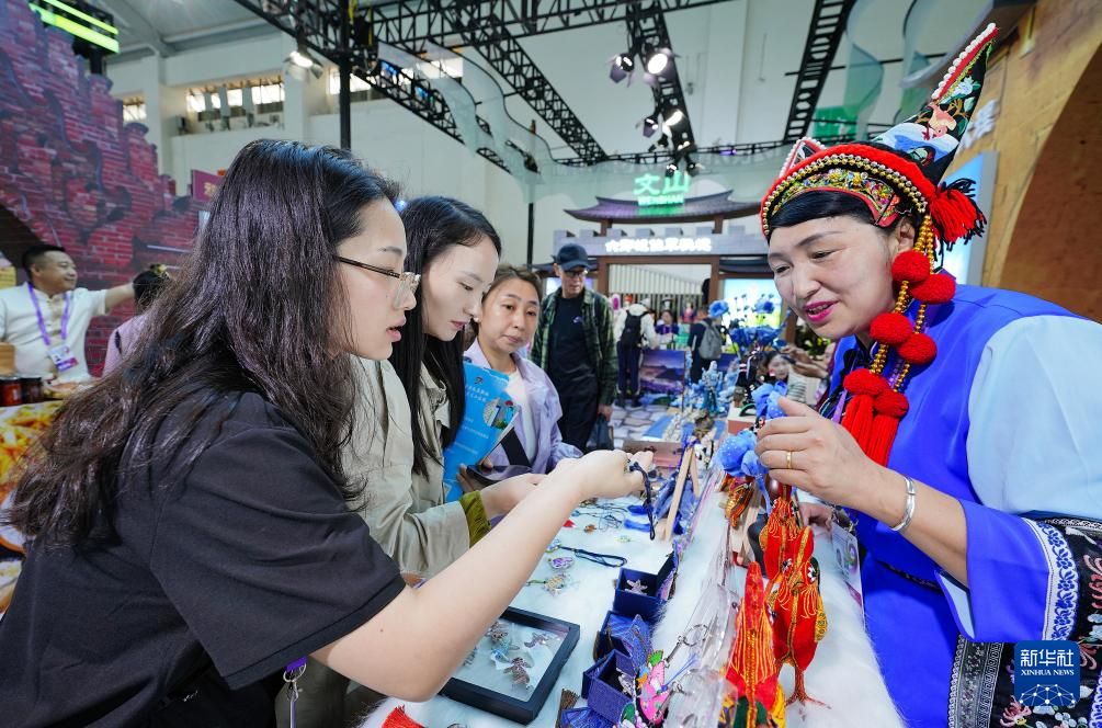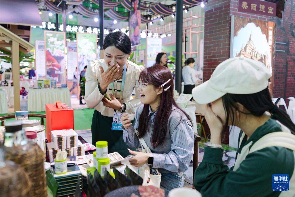 6月20日,觀眾在第9屆中國—南亞博覽會旅居云南館了解文山壩美的文創產品。新華社記者 高詠薇 攝
