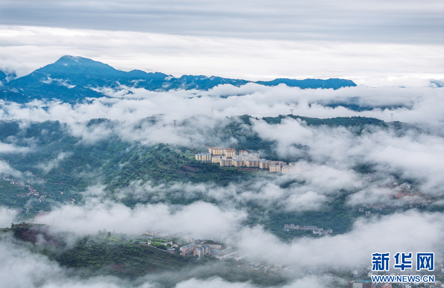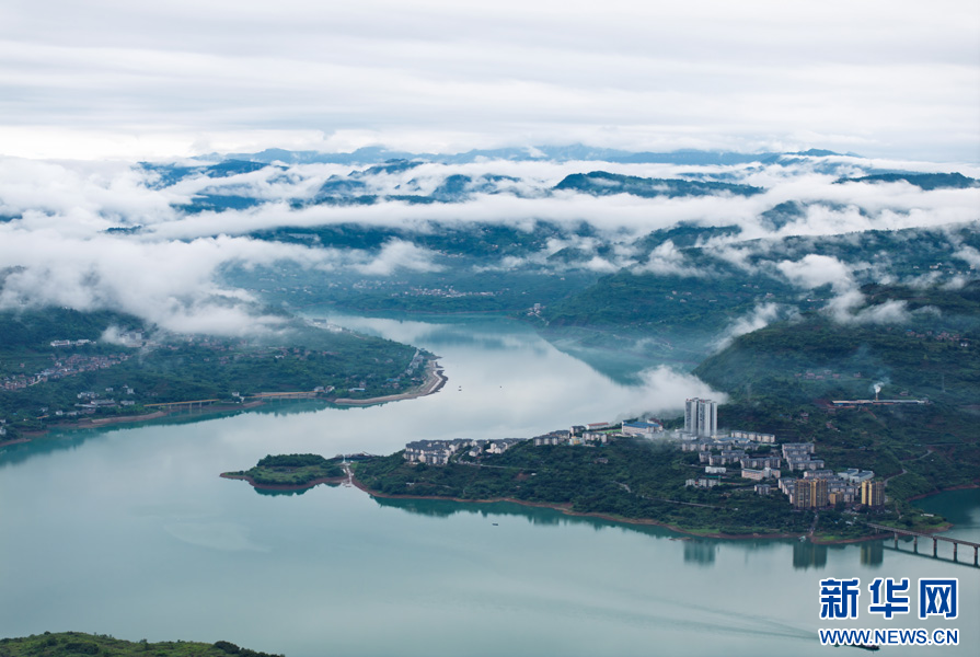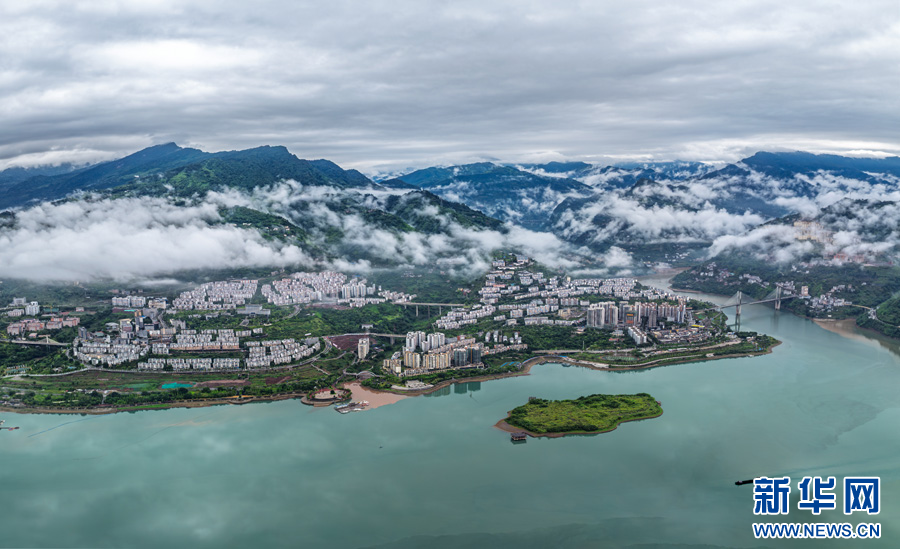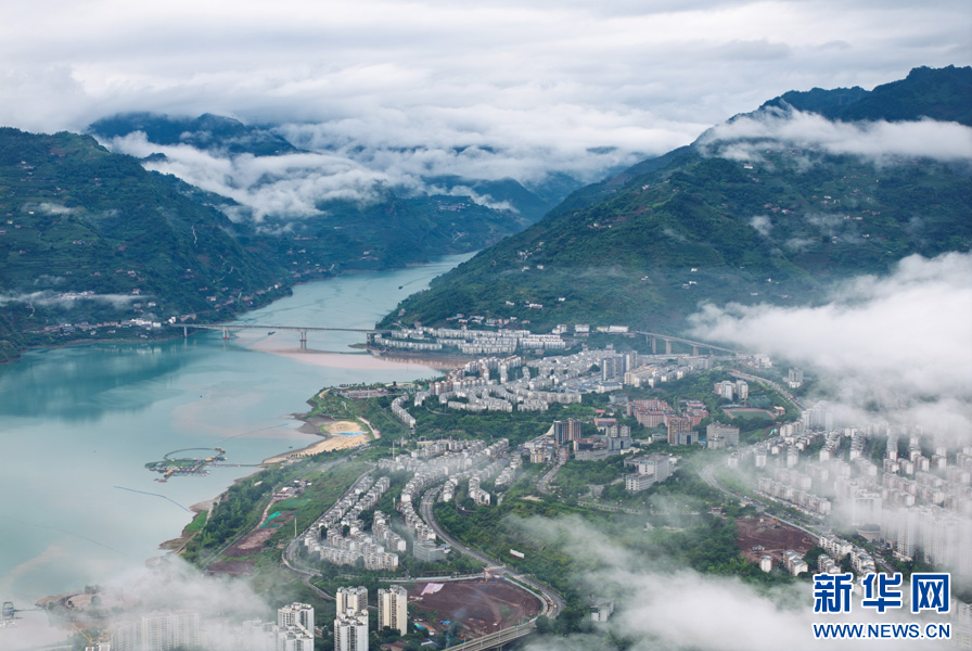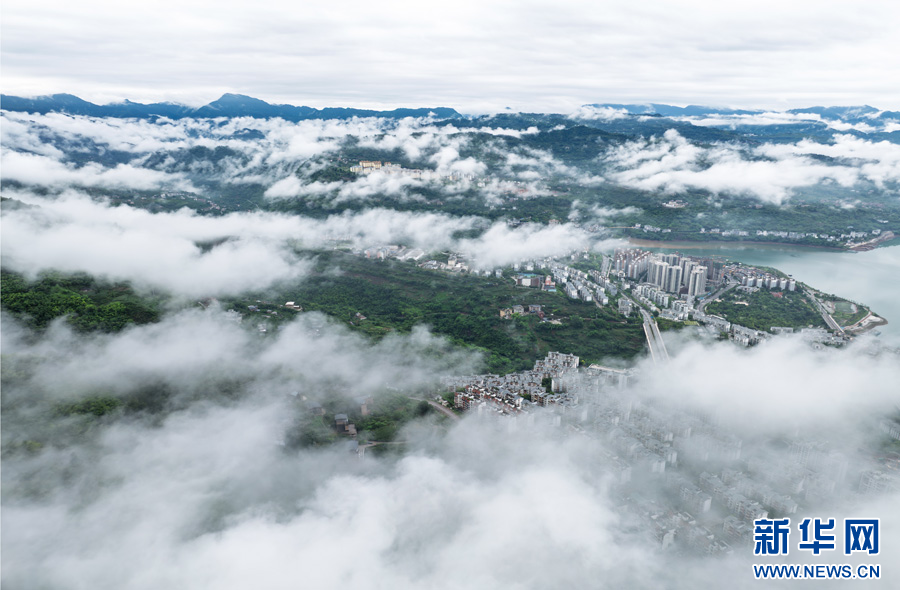 云霧繚繞的綏江縣城(6月30日攝)。新華網發(曾三東 攝)