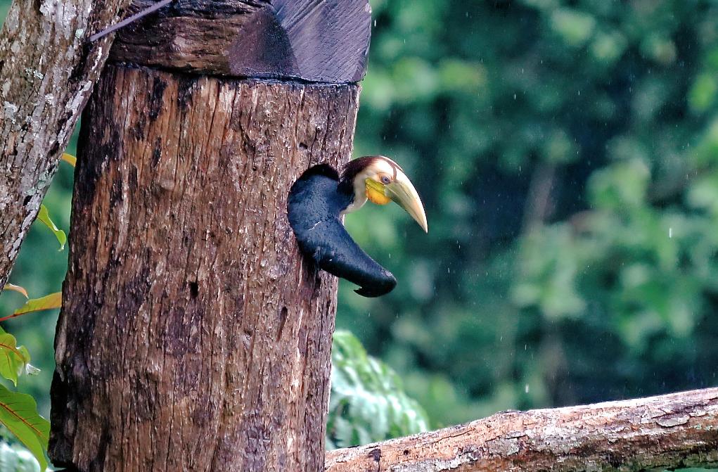 7月3日,在云南盈江“中國犀鳥谷”,一只在人工招引巢箱的犀鳥幼鳥準備出巢。(顏秋 攝)