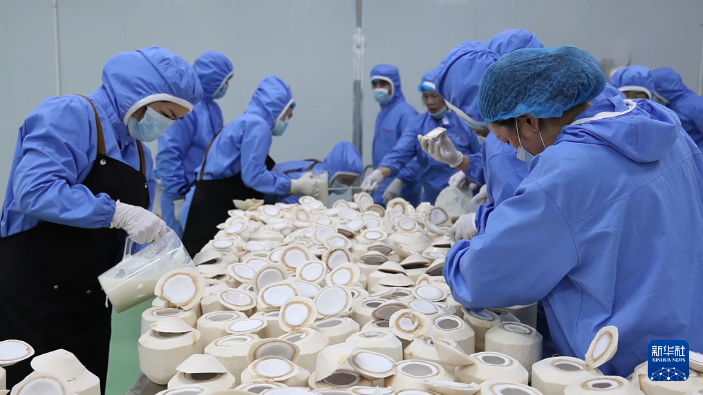 從越南南部的椰林里采收的椰子迅速跨越數百公里,抵達中國云南河口口岸,經海關檢驗檢疫合格后,運往加工廠進行落地加工。這些以邊民互市方式進口的越南鮮椰,在中越邊境河口縣的加工廠里經歷開殼、取汁、殺菌等工序,最終變成香甜的椰子凍,銷往國內市場。