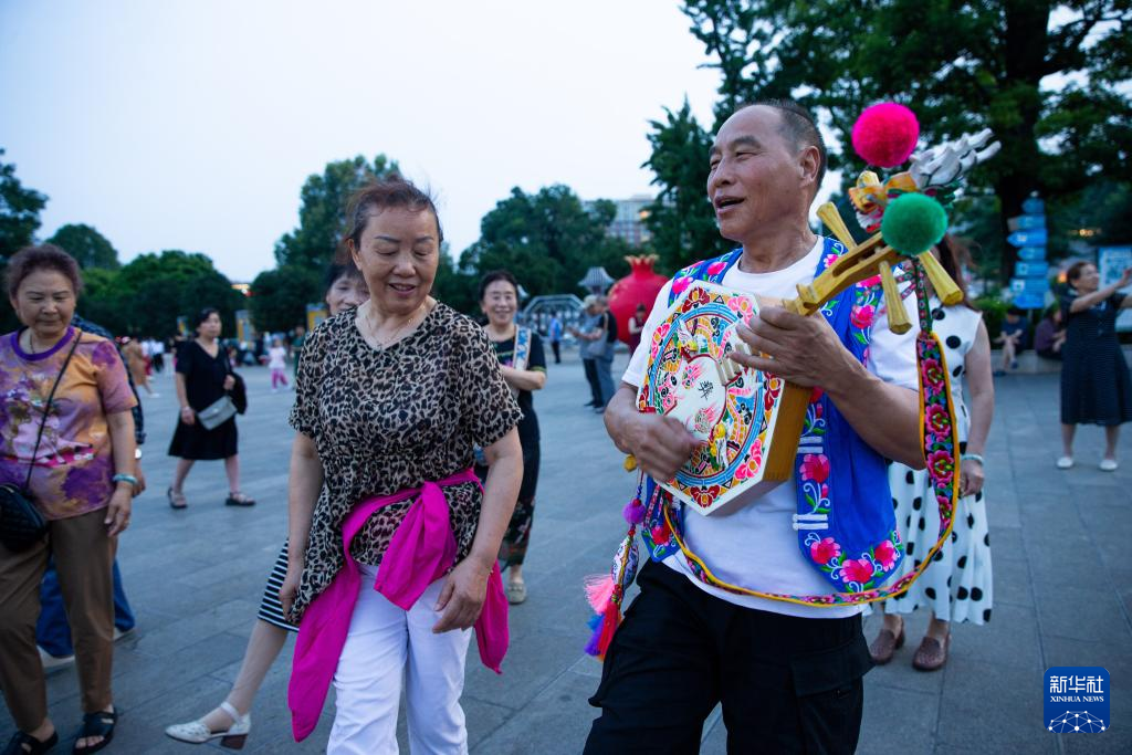 7月15日,來自四川、重慶等地的游客在云南省曲靖市南城門廣場與當地群眾一起“打跳”。新華社發(楊俊鵬攝)