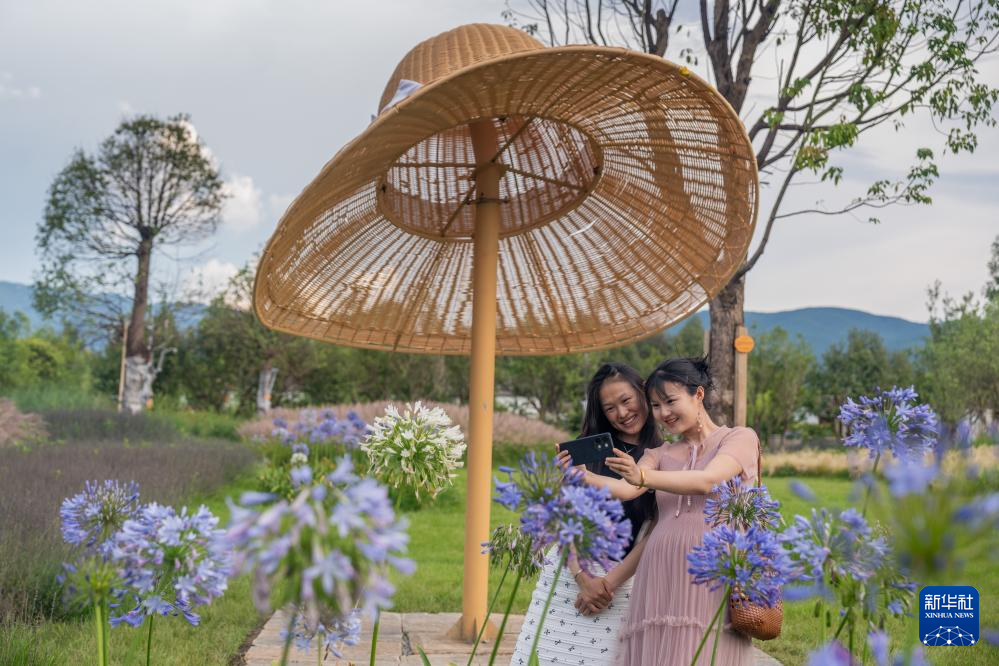 7月15日,游客在云南省大理白族自治州洱源茈碧湖畔拍照游玩。新華社發(羅新才攝)