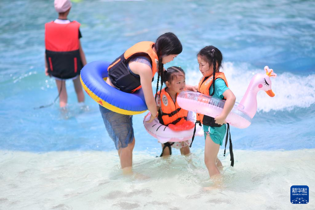 7月15日,在云南省文山壯族苗族自治州文山市臥龍街道龍潭寨一水上樂園,小朋友在家長陪護下玩水。新華社發(熊平祥攝)