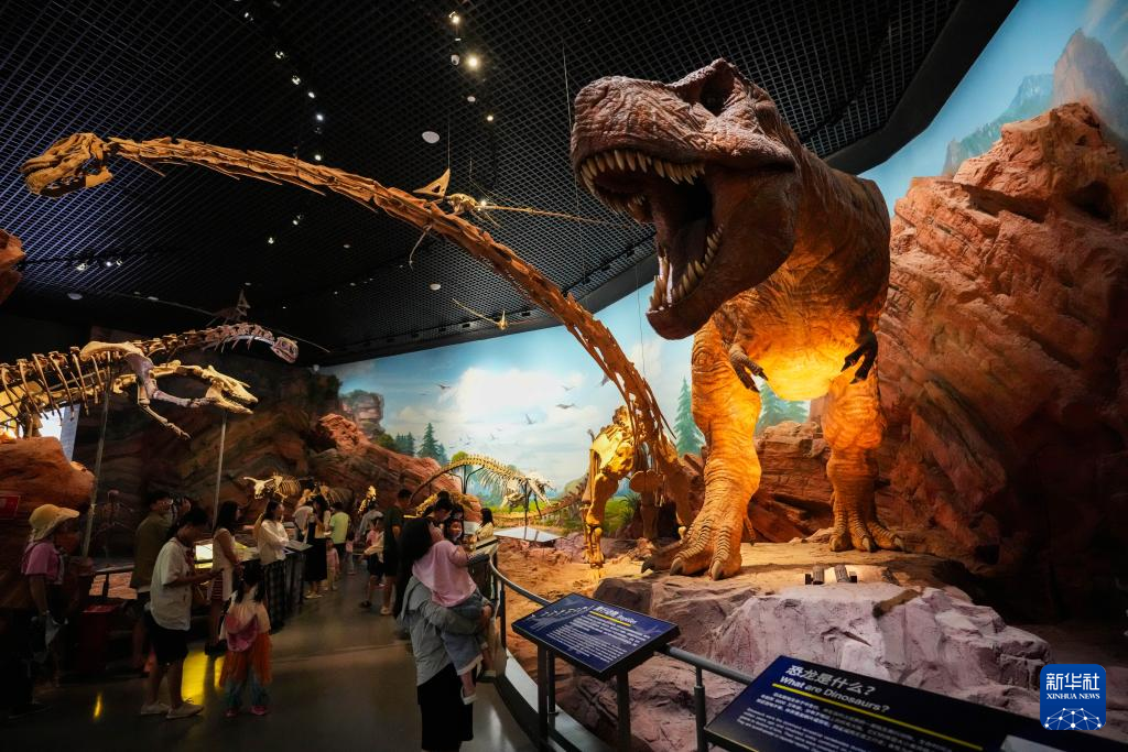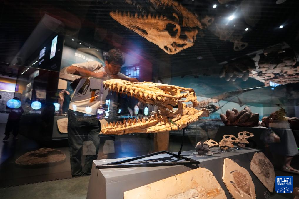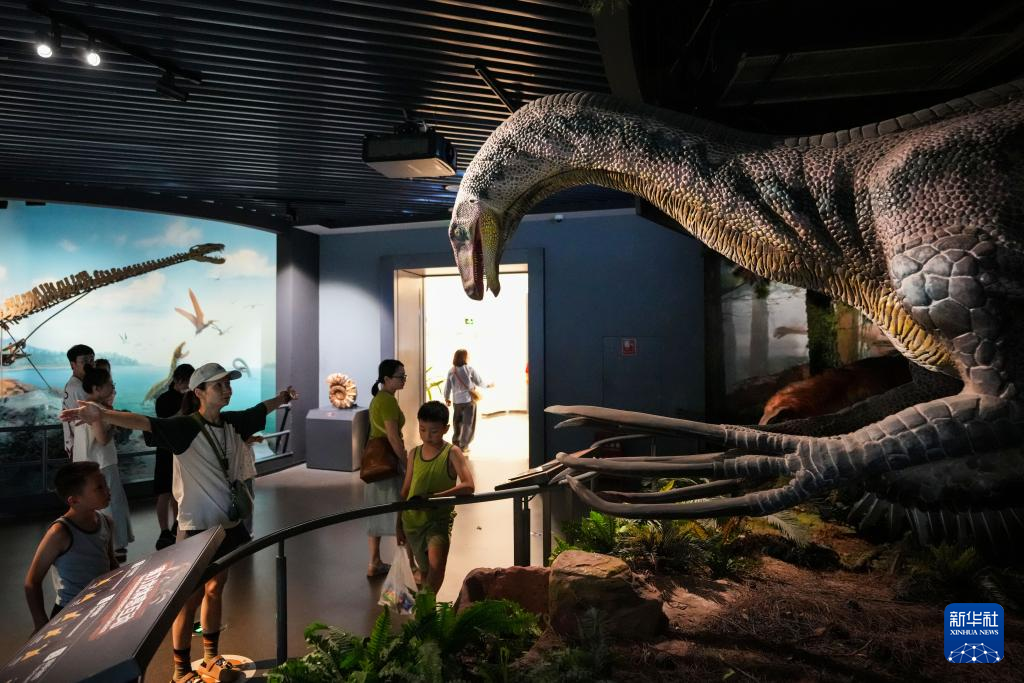 7月15日,游客在澄江化石地世界自然遺產博物館參觀恐龍模型及化石。新華社記者 陳欣波 攝