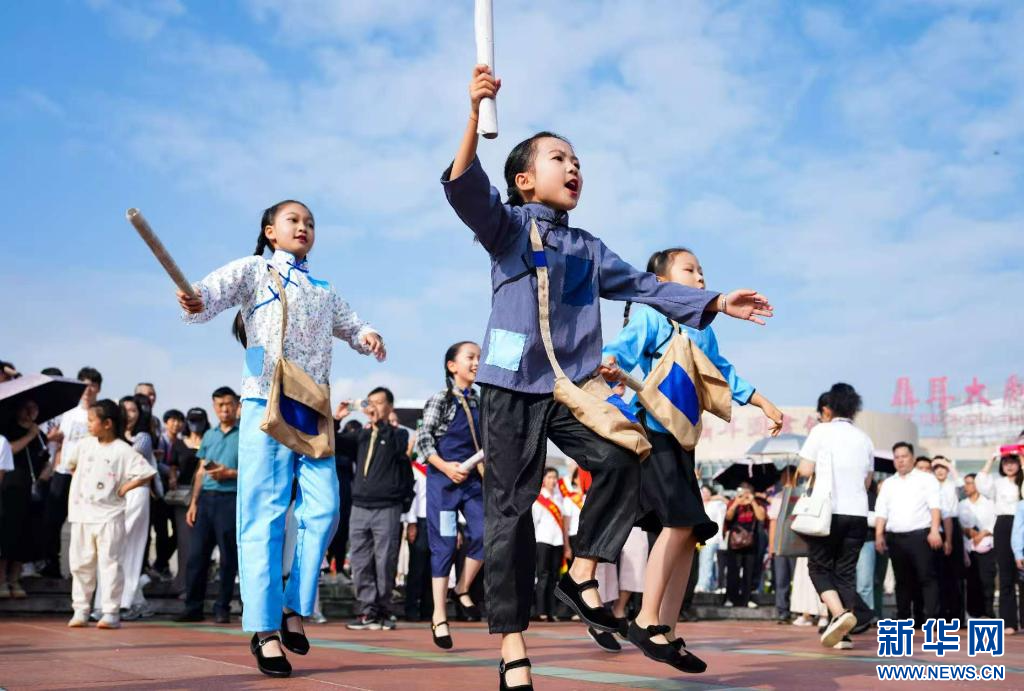 7月17日,小朋友們正在聶耳音樂廣場上表演。(新華社記者 陳欣波 攝)