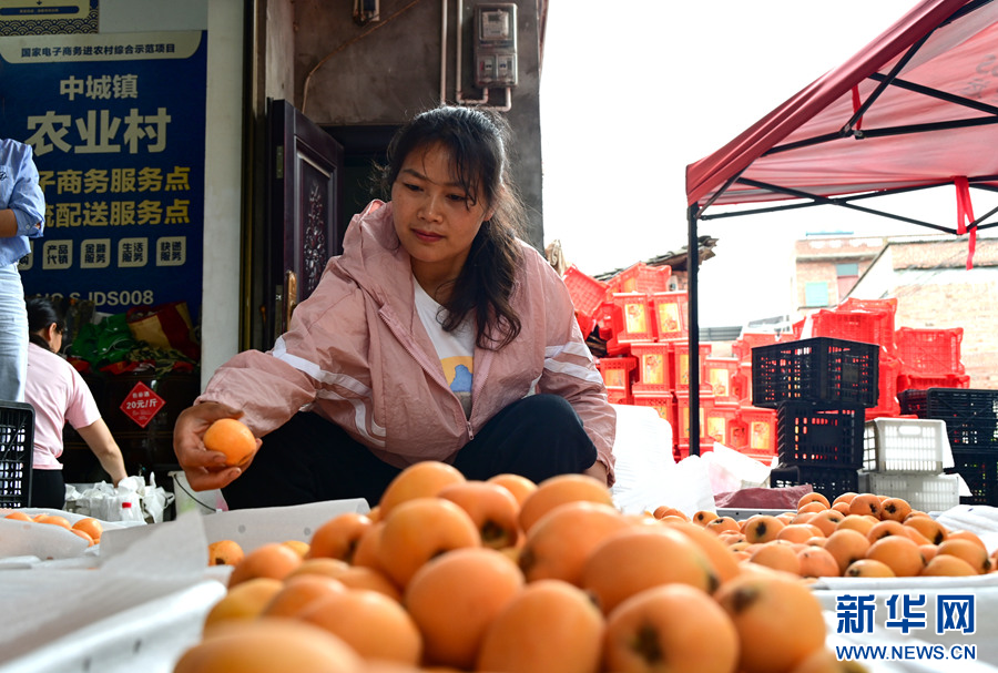在大沙村一個枇杷收購點,工人正在分揀枇杷(5月14日攝)。新華網發(劉起 攝)