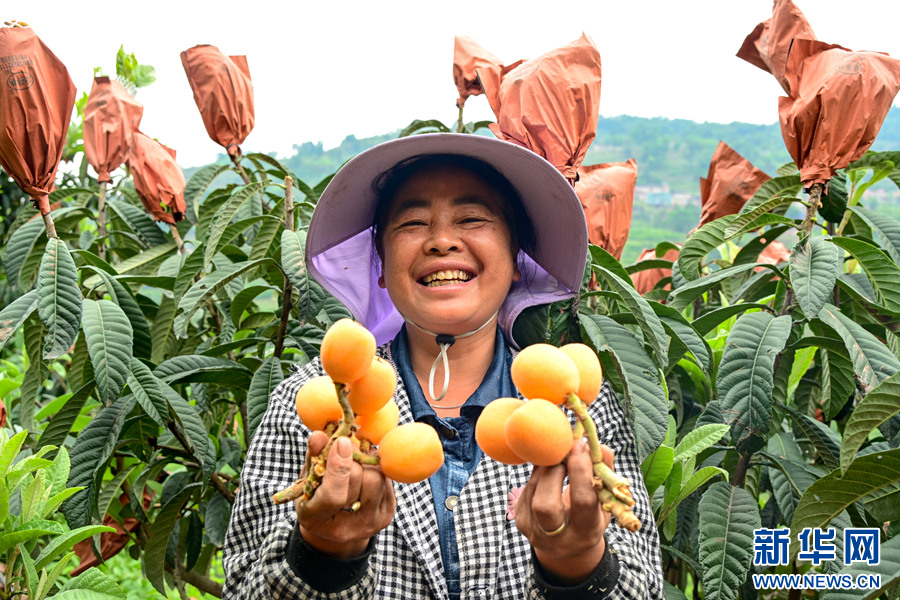 村民手拿剛采摘下的枇杷,露出燦爛的笑容(5月14日攝)。新華網發(劉起 攝)