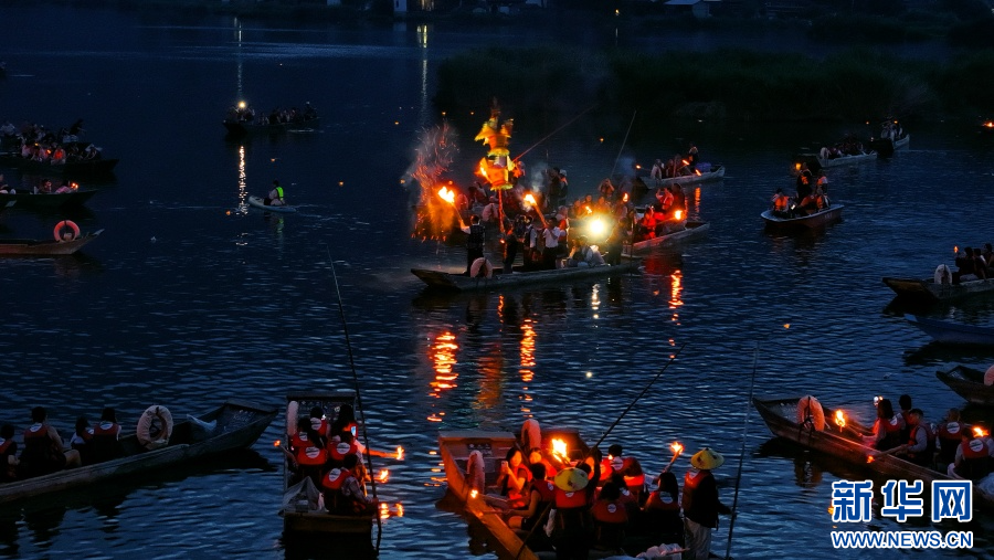 大理洱源,人們在湖上體驗火把節樂趣(7月19日攝)。新華網發(馬雯 攝)